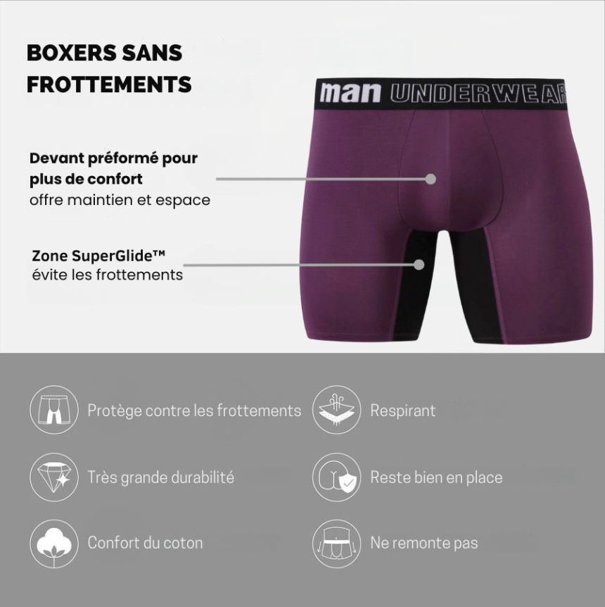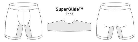 Le matériau SuperGlide™ soyeux et lisse placé à l’intérieur des cuisses de nos boxers anti-frottements élimine la résistance au frottement et te protège ainsi des irritations douloureuses. Découvre un confort de port inédit !
